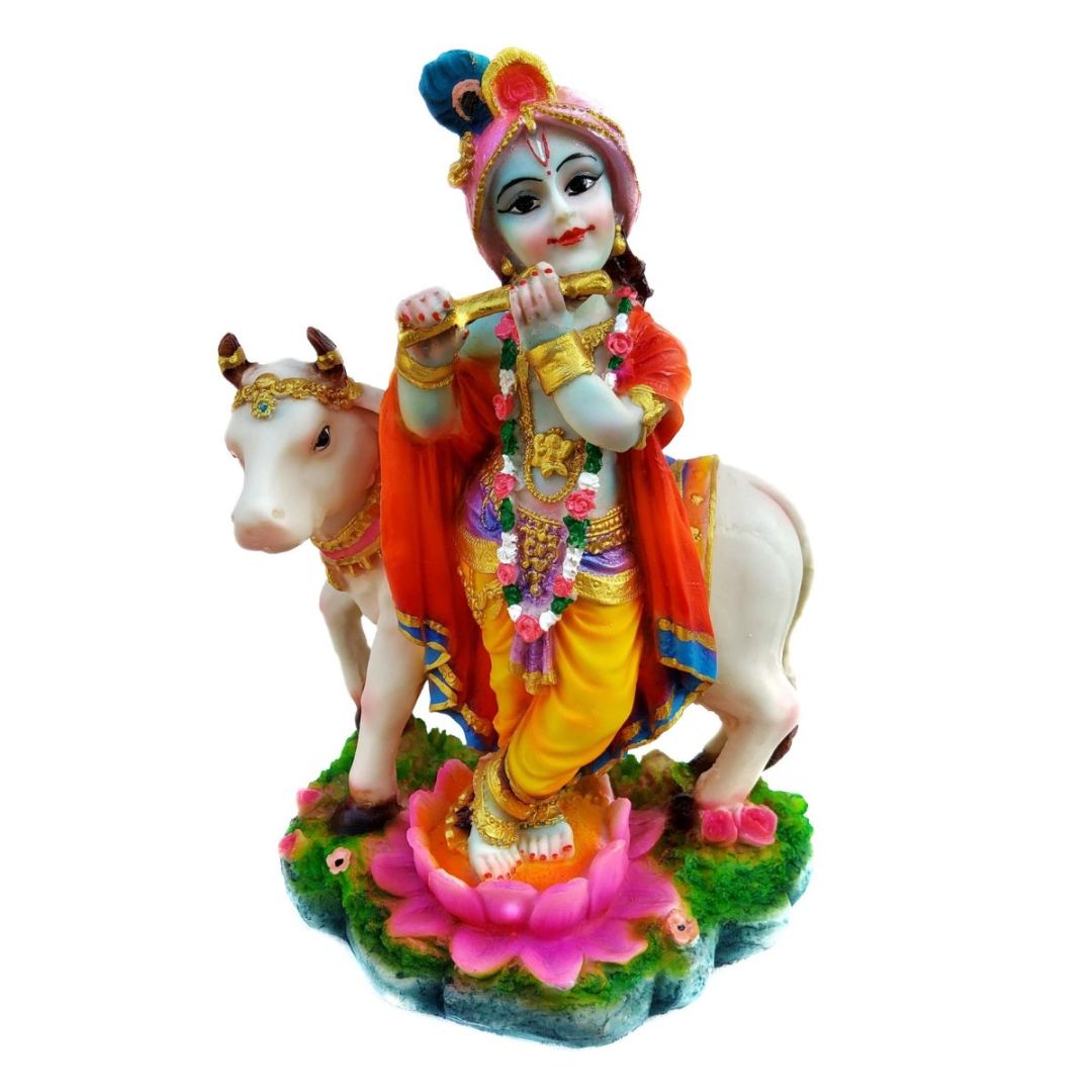 KRISHNA MURTI WITH COW IN POLYMARBLE, 9 INCHES HEIGHT