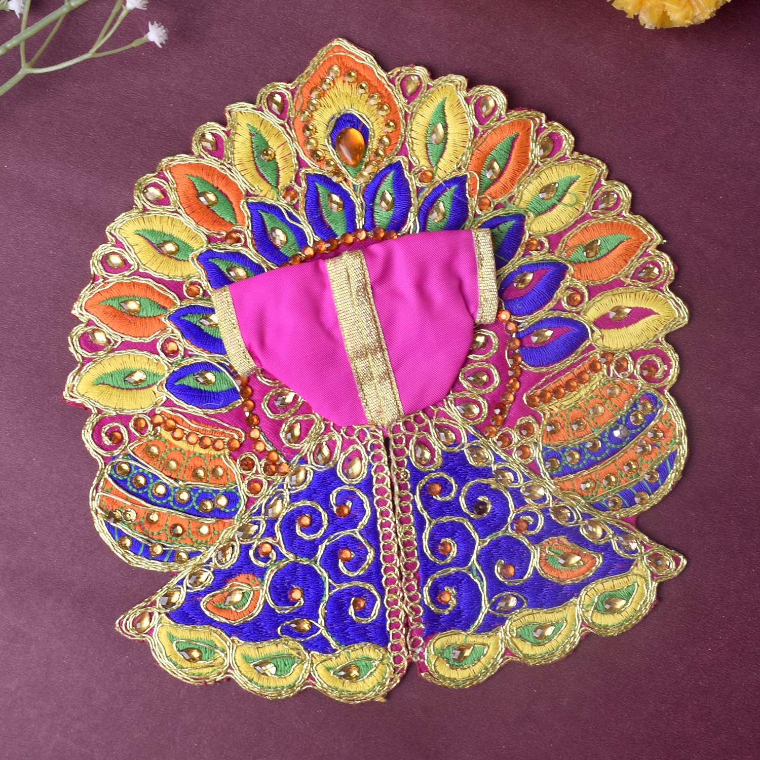 The fine embroidery and glistening stones infuse the outfit with divine charm, making it perfect for Janmashtami, special poojas, or daily darshan. Available in sizes 1, 2, 4, 5, and 6, this exquisite poshak elevates your deity’s look with traditional artistry and vibrant beauty.
