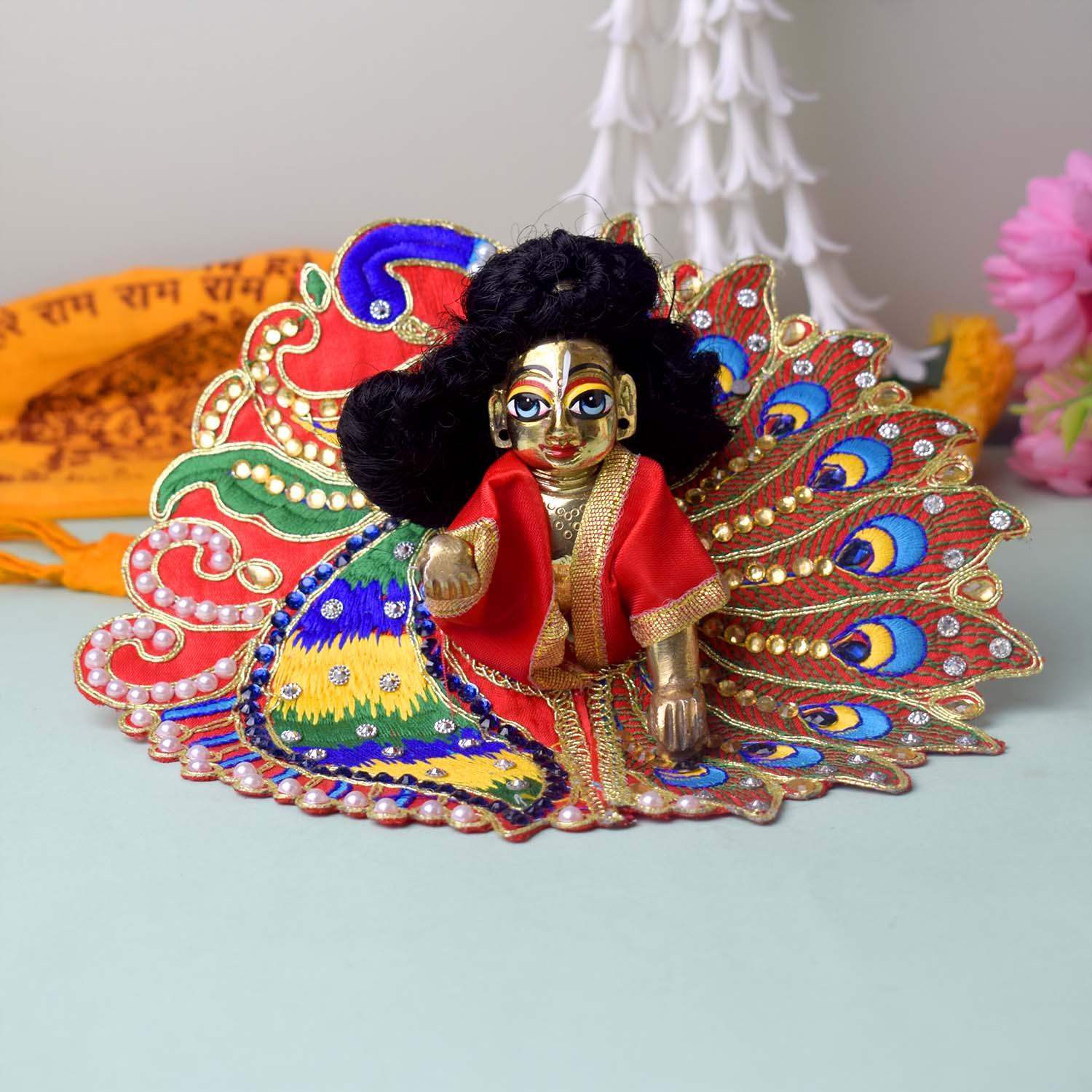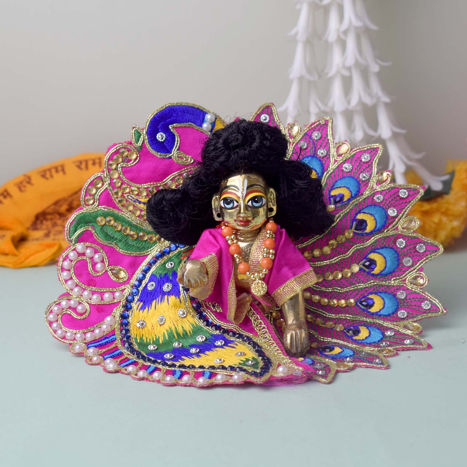 Dress your beloved Laddu Gopal in divine splendour with this exquisitely embroidered dress, featuring traditional peacock and mor pankh designs accentuated with shimmering stonework. Handcrafted with devotion and care, this elegant attire celebrates the celestial grace and vibrant charm of Lord Krishna. The delicate embroidery and sparkling embellishments evoke a sense of spiritual beauty, making it a perfect choice for Janmashtami, daily darshan, or special pooja rituals. Available in radiant shades and multiple sizes, it adds a glorious touch of artistry to your sacred space.