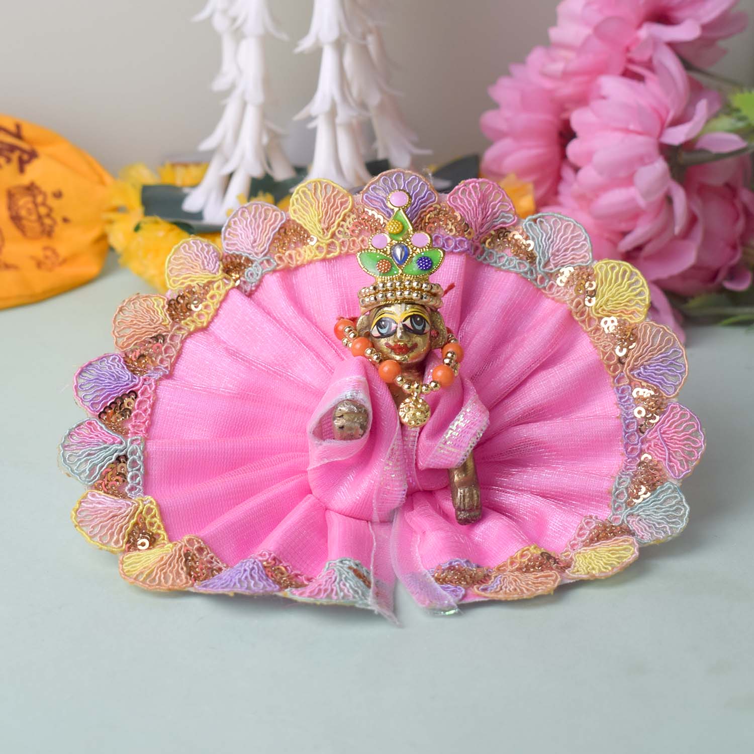 Perfect for Janmashtami, daily pooja, or temple rituals, this premium attire brings out the divine charm of your deity. The soft light pink fabric pairs with intricate embroidery to add a touch of regality and serenity to your worship space. Elevate your pooja room with this unique, handcrafted piece, blending devotion and artistry in perfect harmony.