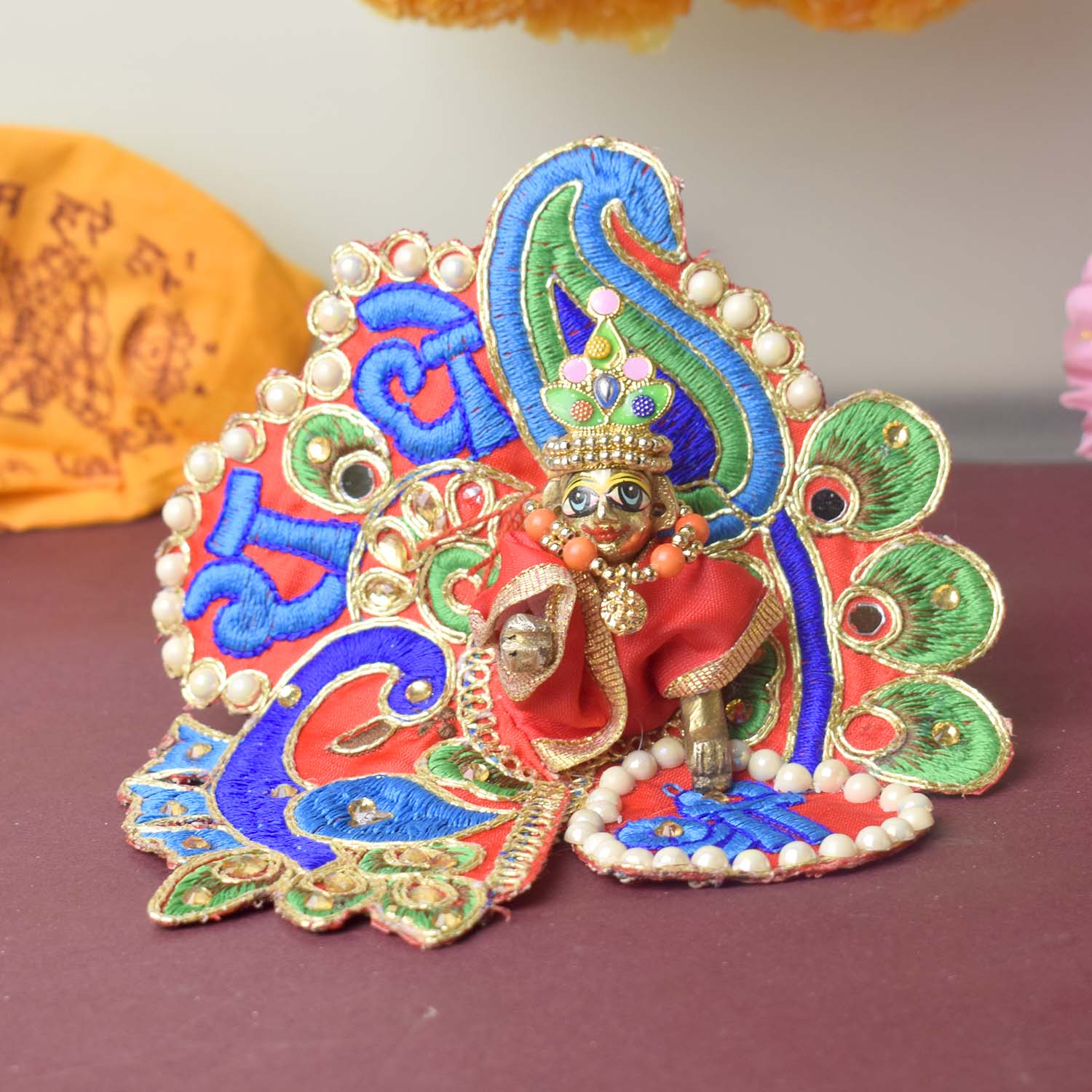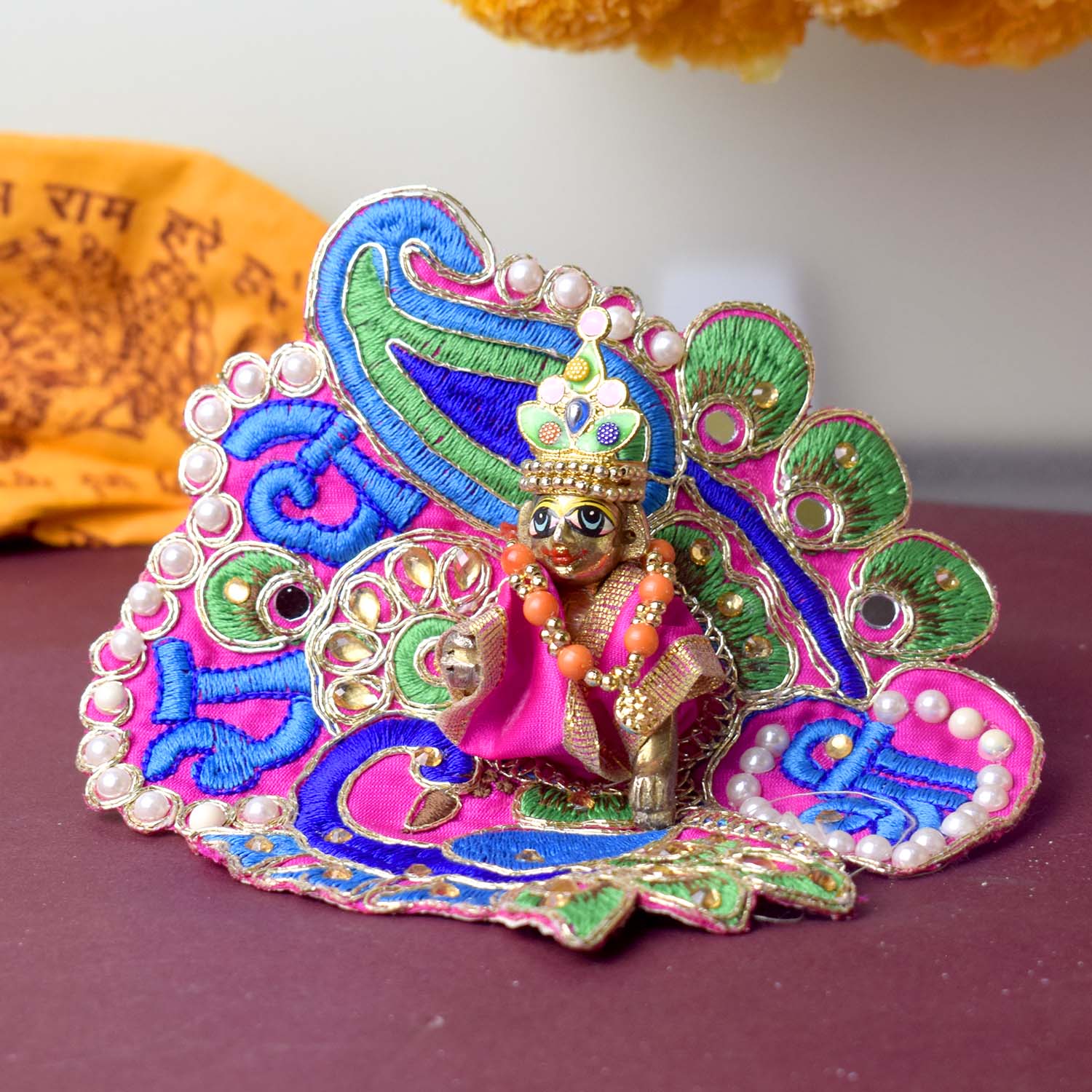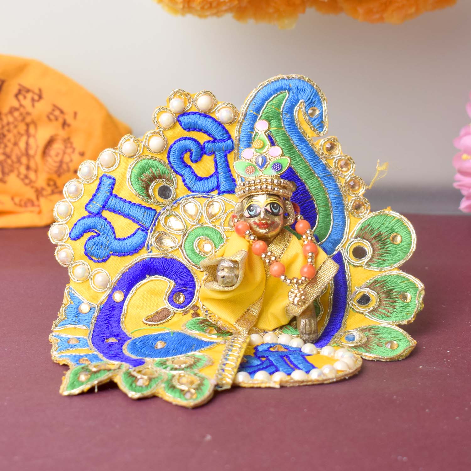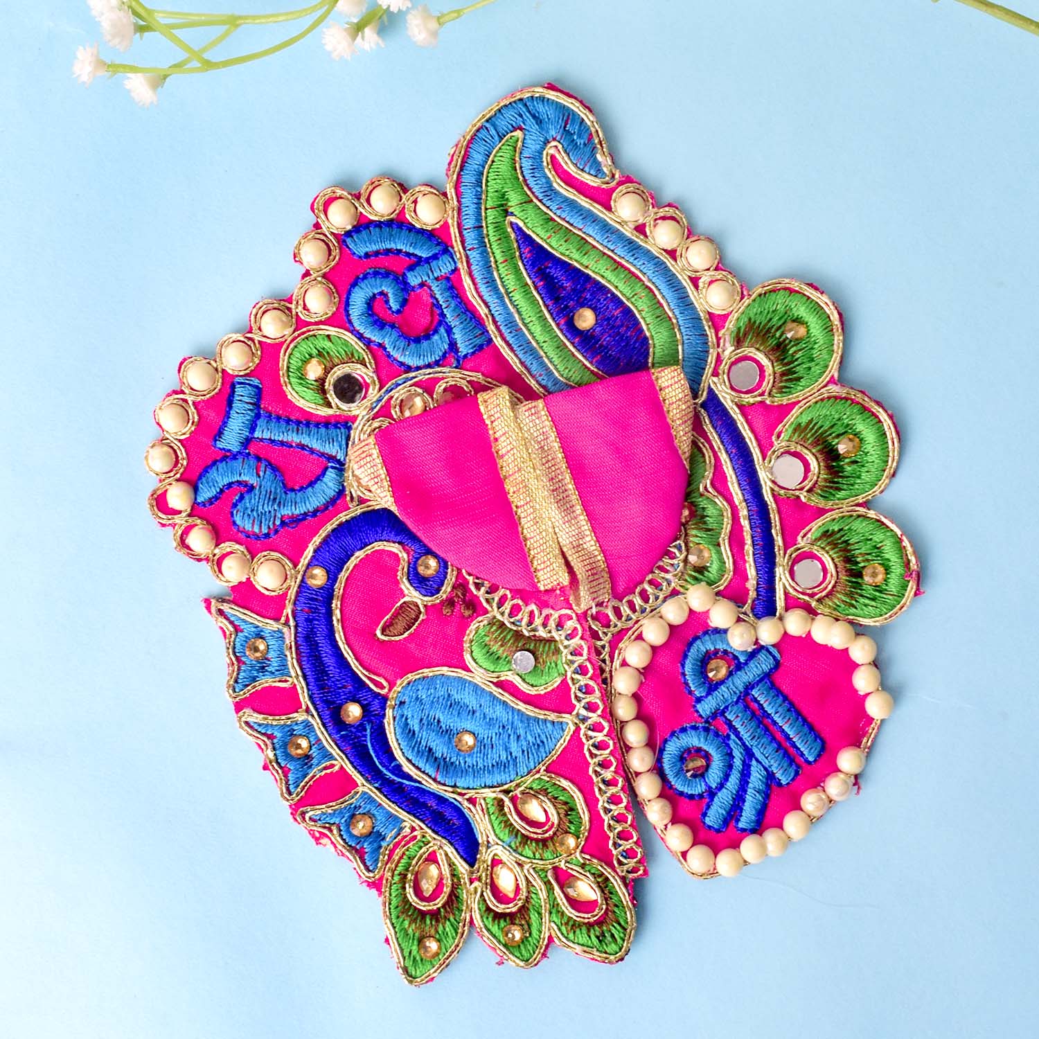 Celebrate devotion and artistry with our stunning Laddu Gopal dress, featuring the divine “Shri Radhe” embroidery as its central highlight. This exquisite poshak combines detailed stonework with a graceful peacock-inspired silhouette, radiating divine charm. The sacred Shri Radhe inscription brings deeper meaning and elegance to your pooja rituals.